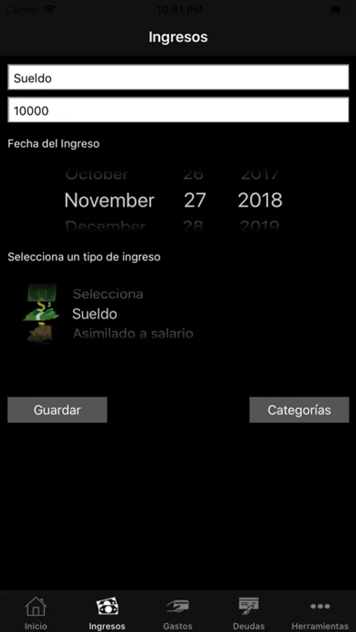 Ingresos: Agrega tus ingresos por fecha, clasificándolos, colocando importes y desde el menú reportes y movimientos se pueden actualizar.