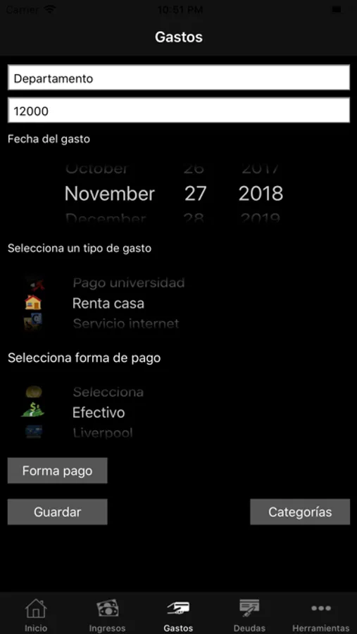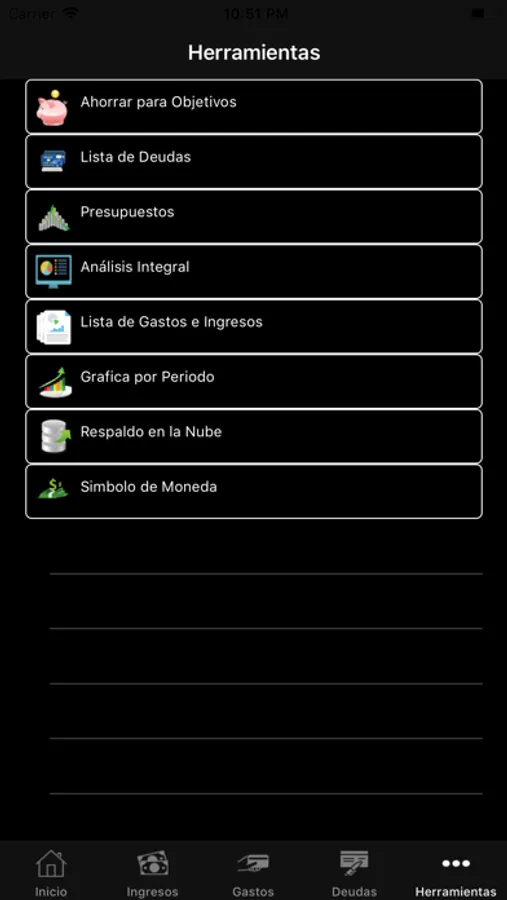 Deudas: Puedes registrar, actualizar o eliminar deudas que vayas adquiriendo, así como ir administrando pagos relacionadas a esta deuda para poder saber en cuanto tiempo podrás terminar de pagar.