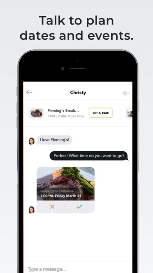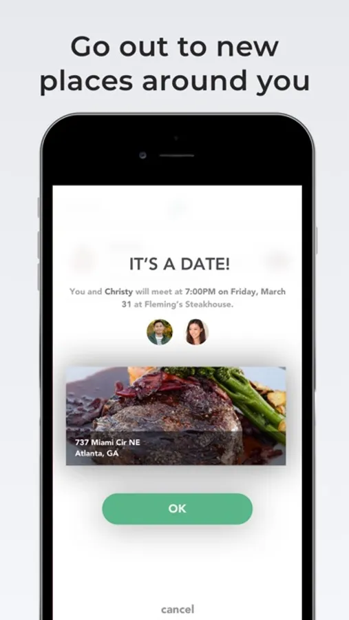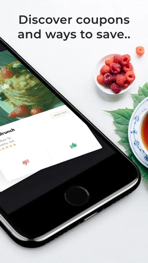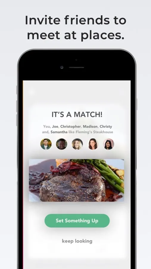 Here’s how it works. Swipe to find things to do around you. We show coupons and places (via Groupon) giving you ways to save money on things near you. Swiping to right likes the place. When one of your friends likes the same places, you can set up an event. Now, you can chat to and send an invite, right in the app.
