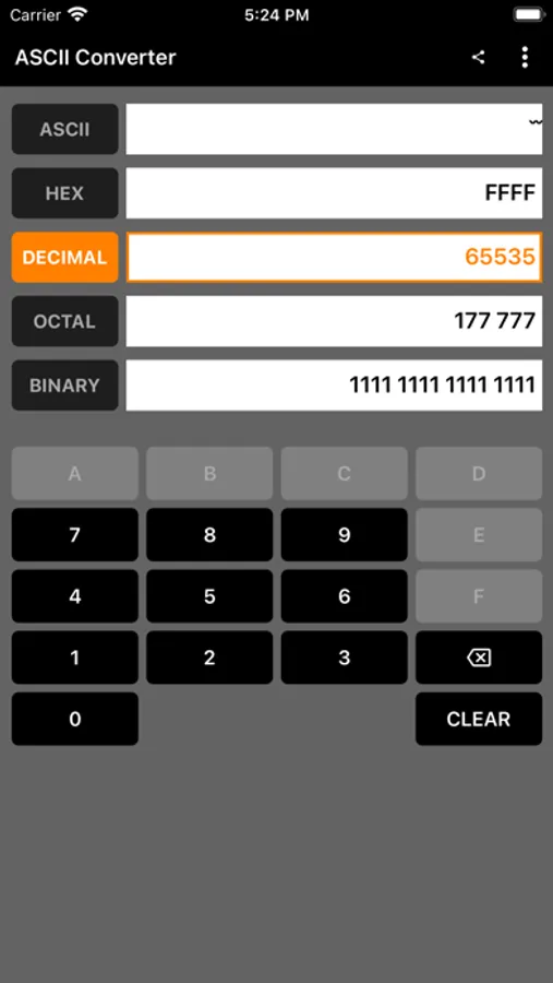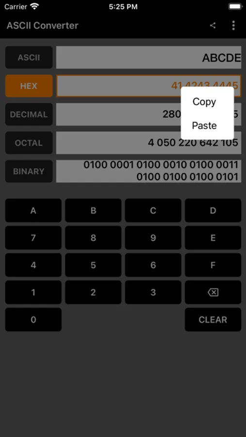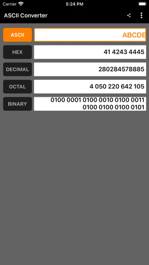 ASCII Converter app is designed for EASY, QUICK and SIMPLE conversions between ASCII, Hexadecimal, Decimal, Octal and Binary.