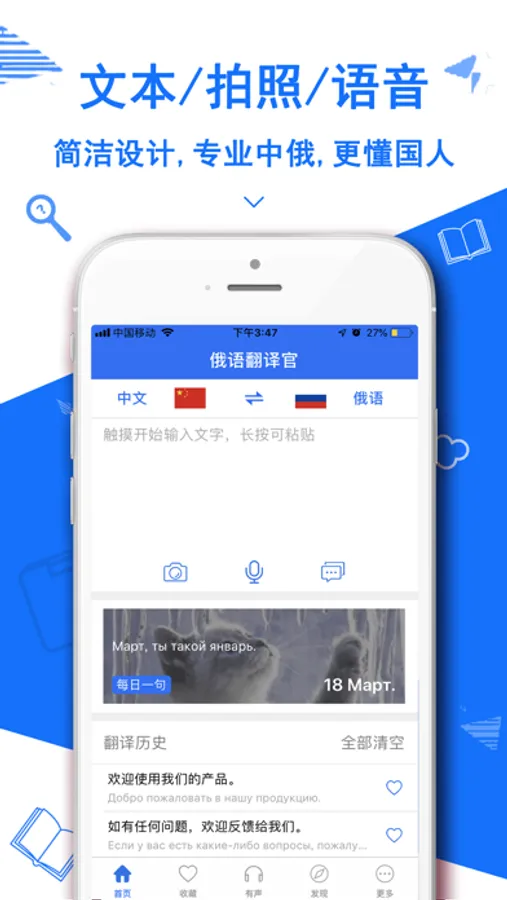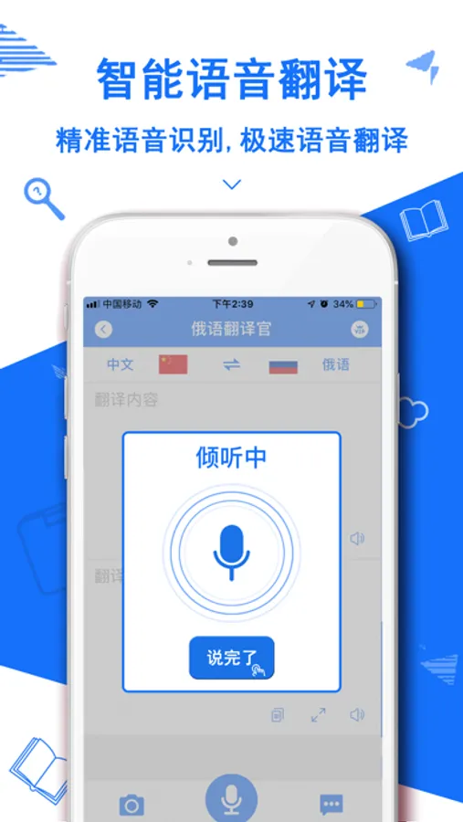 3,语音翻译:最新人工智能技术,高分辨率人声识别转为文字翻译!俄国旅游/俄语学习必备翻译助手。
