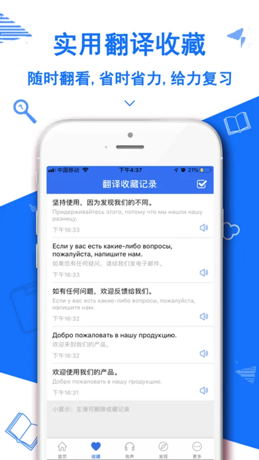4,翻译收藏:单词生词、不熟的常用语、经典名句、旅游专用语、商务日常用语、通通收藏,随时随地翻看和朗读。