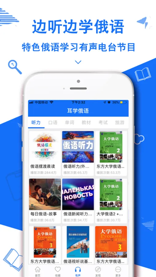 4,耳学俄语:整合更多使用有声俄语资料,从听力、口语、单词等多方面提升。