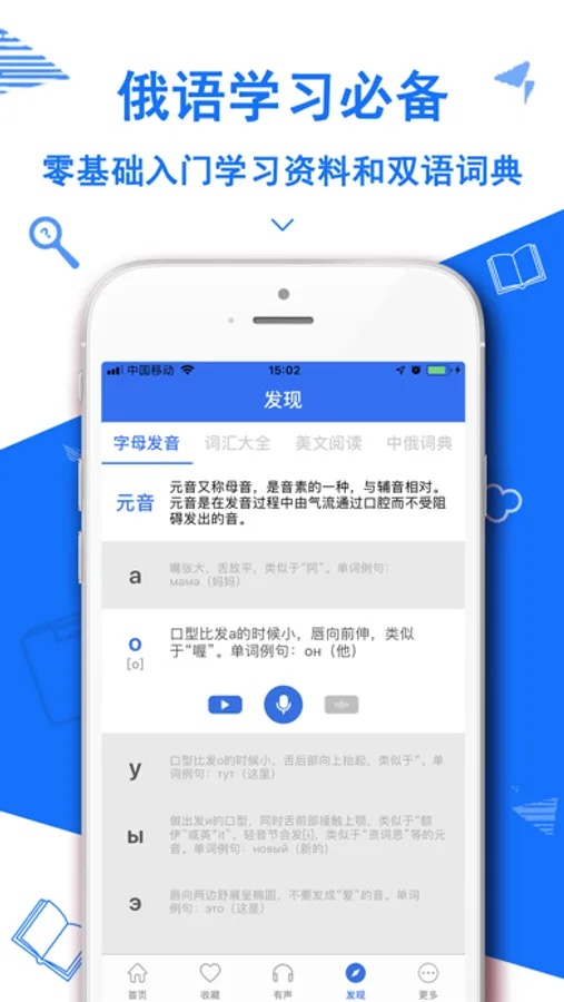 《俄语翻译官》全能俄语翻译App,地道文本精准翻译,随身拍照翻译,智能语音识别翻译,俄国旅行俄语学习必备翻译助手!新版优化了翻译功能,同时整合了俄语学习资料:字母发音、基础词汇大全、双语文章阅读、中俄双语词典、更多有声资料。