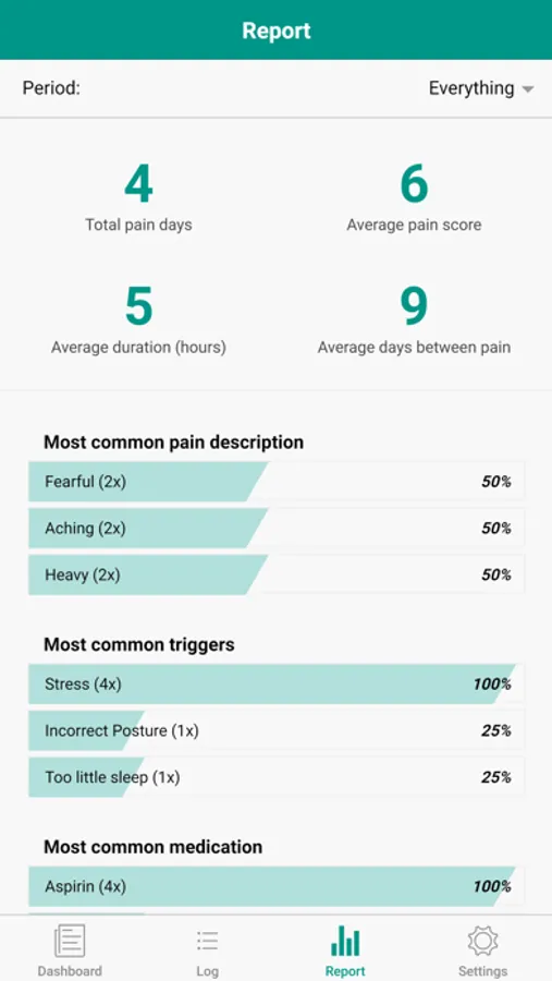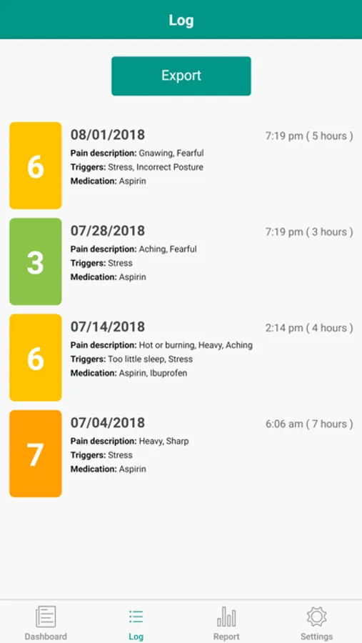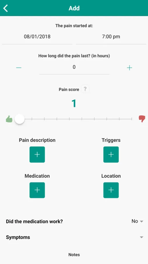 This app makes it easy to track your pain & symptoms and report to your doctors. Use our pain diary to keep track of your pain over time and share it with your doctor at your next appointment. Track a variety of pain elements, including location, pain duration, triggers and more.