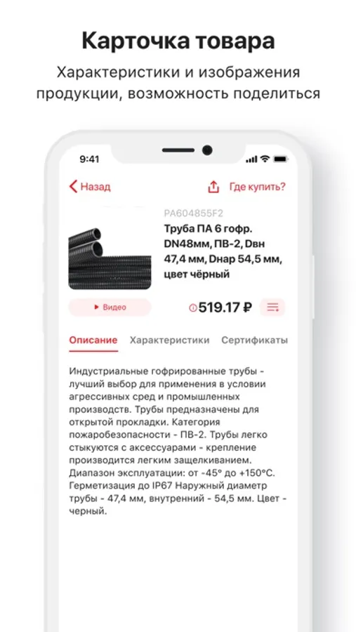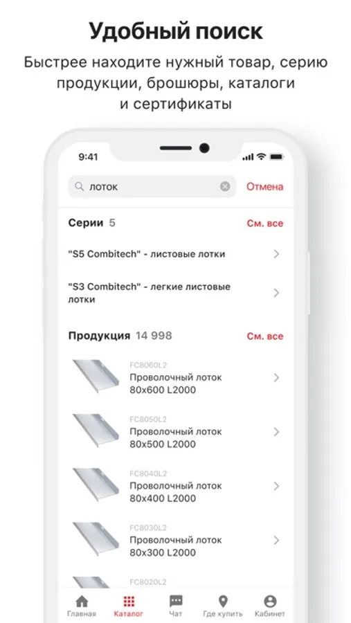Каталог продукции. Фильтруйте, сортируйте, просматривайте детальную информацию о продукции: характеристики, сертификаты, чертежи, каталоги, цены. Выполняйте поиск продукции по штрихкоду, коду или названию. Делитесь ссылкой на товар с другими людьми.