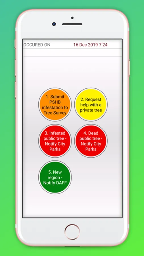This app allows PSHB infestations to be reported so that appropriate treatment can be initiated. Reporting the infestation also allows the spread of the PSHB to be measured and tracked so that local organisations can be notified and appropriate measures taken.