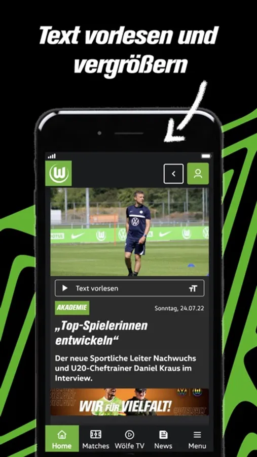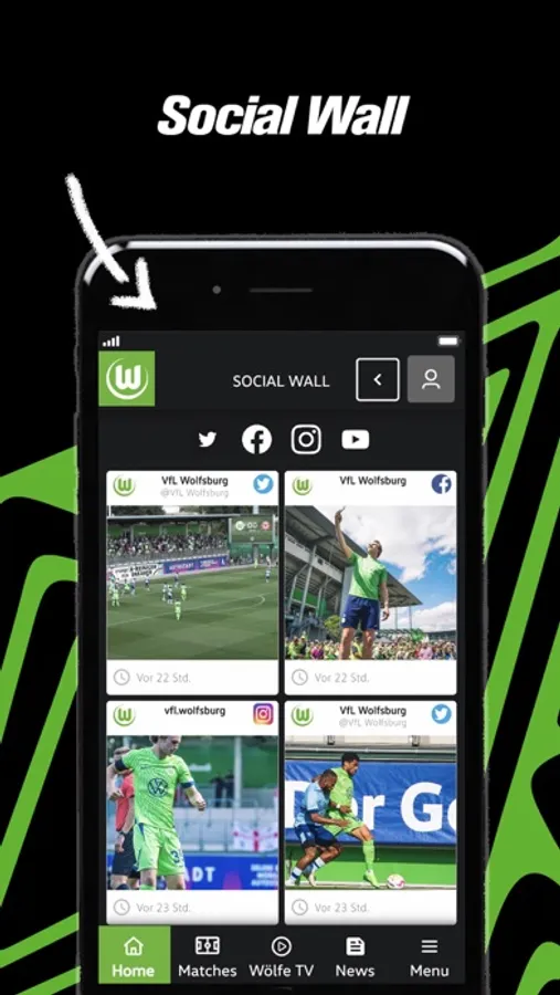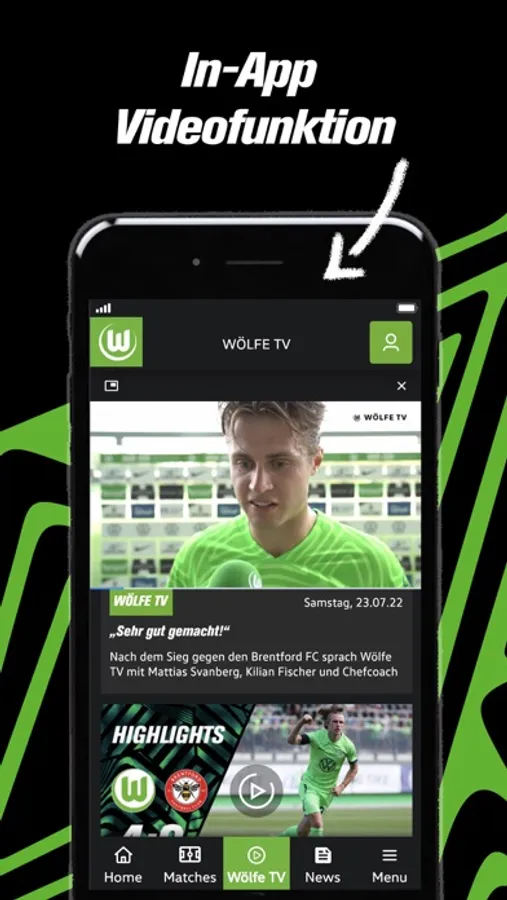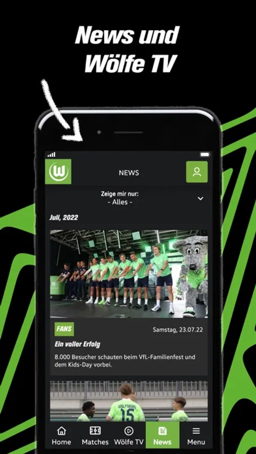 On matchdays, our app is an absolute must-have for every VfL fan. We send you notifications when the line-up is announced, a goal is scored or there’s a penalty, inform you about special offers and provide exclusive highlights. Use the app as a second screen displaying statistics about the current matchday. Don’t miss a minute of the game: our Wölferadio and live ticker team report to you in real time from the stadium.