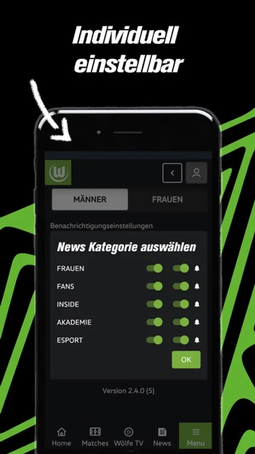 • Individuell anpassbar: Team, News und Benachrichtigungen des VfL sind frei wählbar