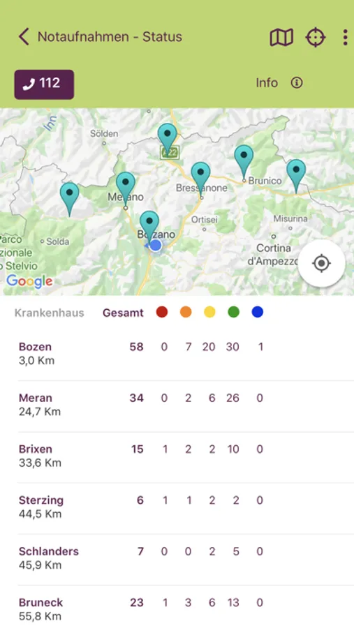 Notaufnahmen - Status: Anzahl von Patienten und Patientinnen, die in den verschiedenen Notaufnahmen der Krankenhäuser des Südtiroler Sanitätsbetriebes warten, eingeteilt nach zugewiesenem Triage-Kodex (Manchester Triage System)