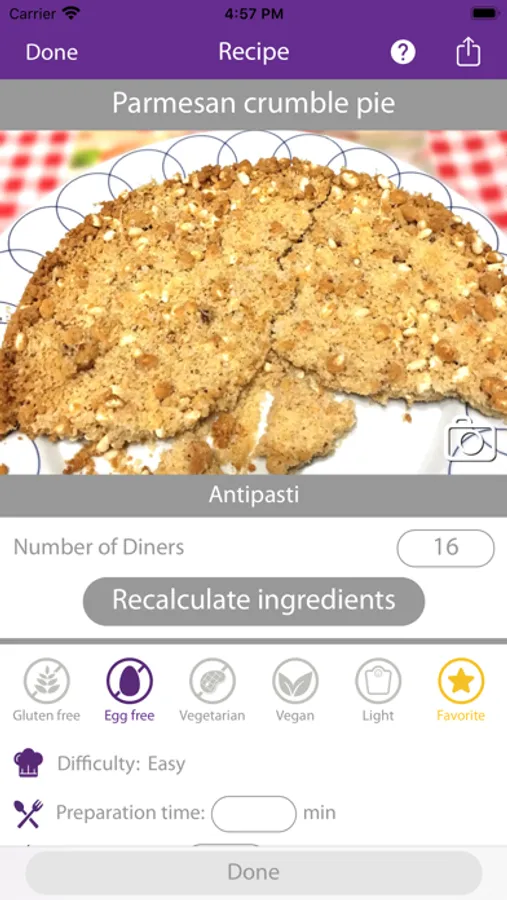 - recalculates the ingredients of your recipes based on the number of people or the quantity of a specific ingredient;