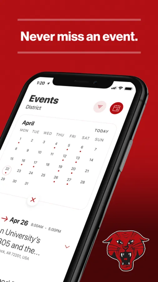 The event section shows a list of events throughout the district. Users can add an event to your calendar to share the event with friends and family with one tap.