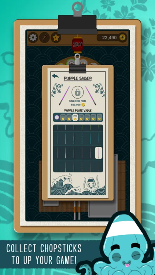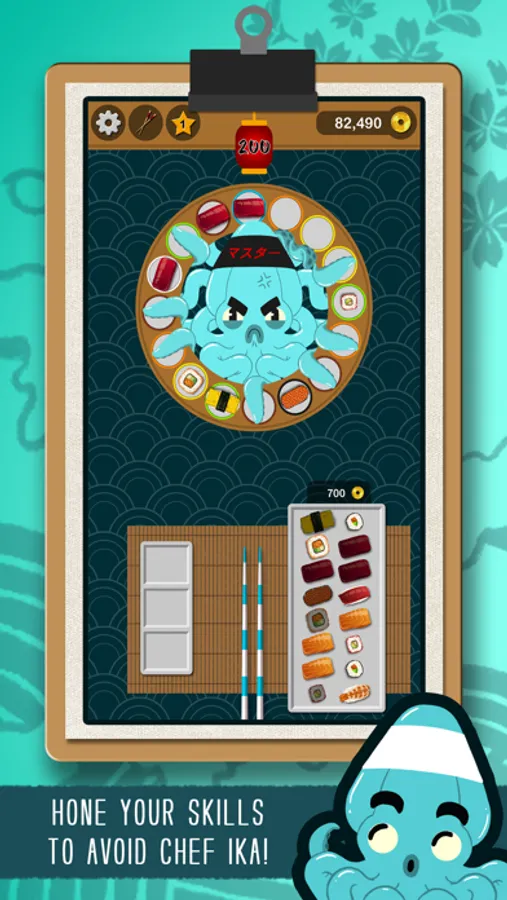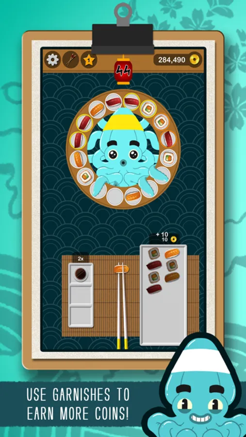 Welcome to Bushido Sushi; a fast-paced precision game for sushi lovers! Simply tap on the screen to use your chopsticks to grab freshly made sushi from the conveyor belt. Utilize accuracy and skill to complete your platter while avoiding Chef Ika's tentacles. Snatch garnishes, such as wasabi and soy sauce, to increase the amount of coins earned per sushi. Unlock over 50 new chopsticks to up your game and increase your profit. At each 20th Level show Chef Ika what you are made of by acing his exam and advance to the next rank.