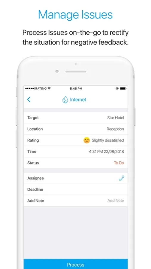 iRATING is used by Supervisor and Assignee to manage issues on the go. Issues are negative feedback from your customers. The Supervisor can also analyze customer response results via powerful reports so that can have immediate actions to improve company services/products and customer satisfaction.