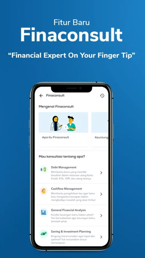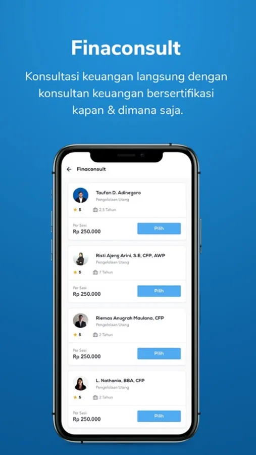 Fitur terbaru dari Halofina. Sekarang kamu bisa konsultasi keuangan langsung dengan konsultan keuangan bersertifikat secara mudah, aman dan professional dengan biaya yang terjangkau. Seluruh konsultan keuangan telah terkurasi oleh Halofina dan ZAP Finance sebagai partner.