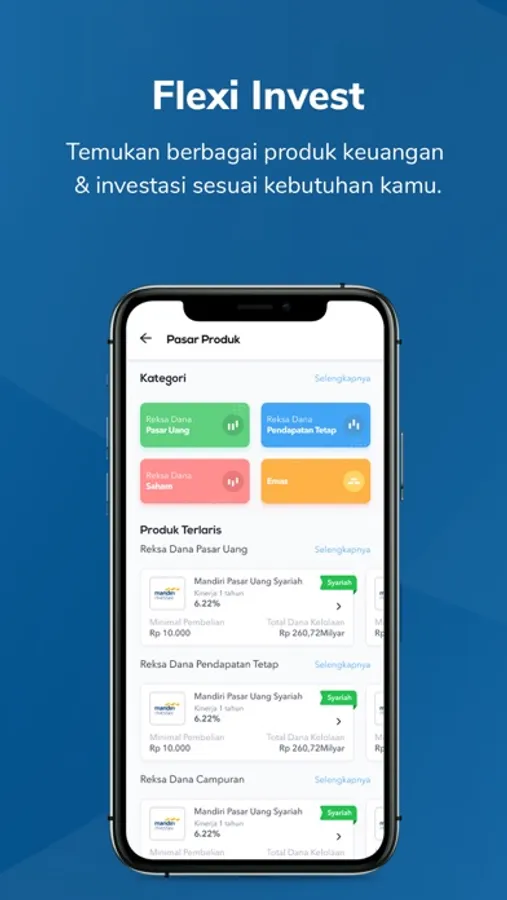 Temukan berbagai produk investasi yang sesuai dengan kebutuhanmu, mulai dari reksadana pasar uang, reksadana pendapatan tetap, reksadana campuran, reksadana saham, dan emas.