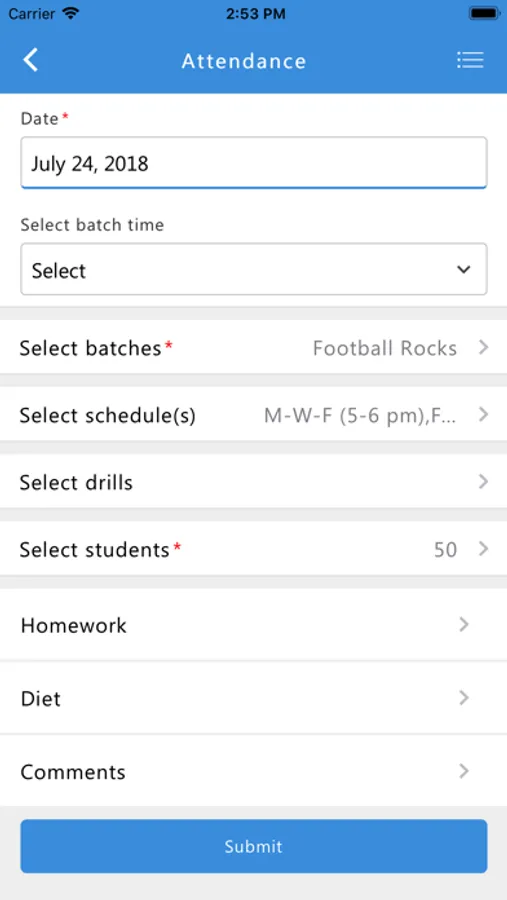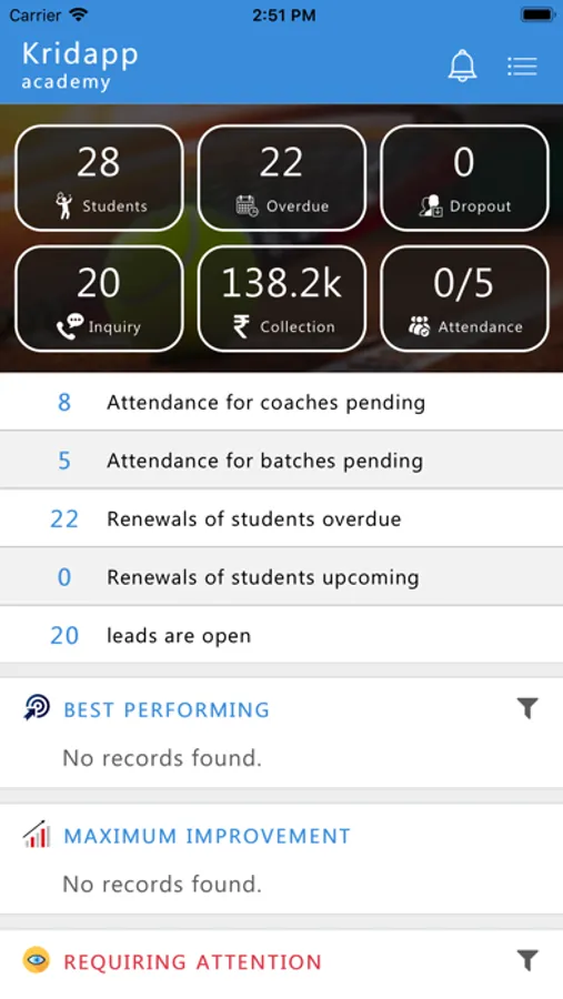 Manage coaches with their expertise. Assign batches to the coach. Coach can take the attendance and log detailed analytics of their students.