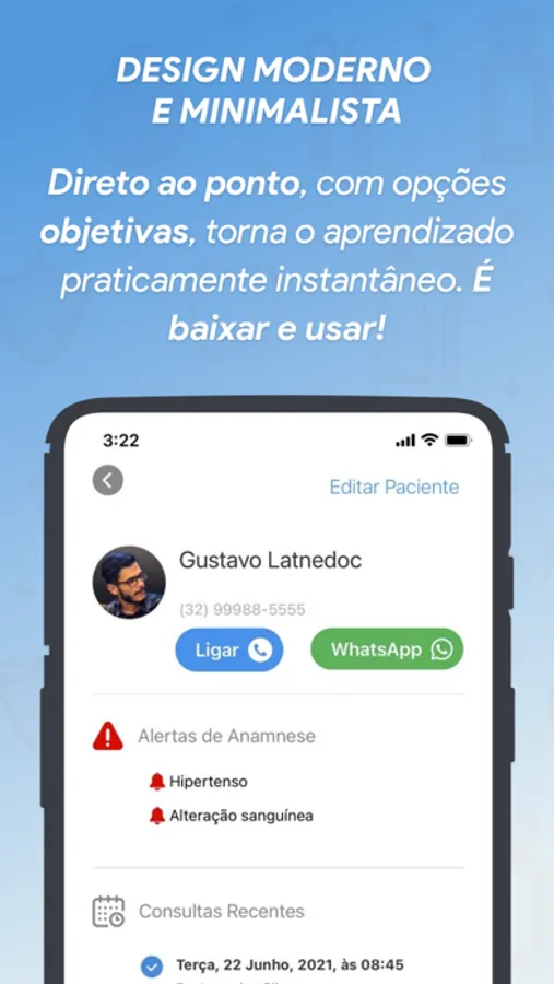 Precisa entrar em contato com seu paciente? Utilize o botão "Ligar" ou o botão "WhatsApp" para contacta-lo sem precisar adicionar a agenda do seu celular.