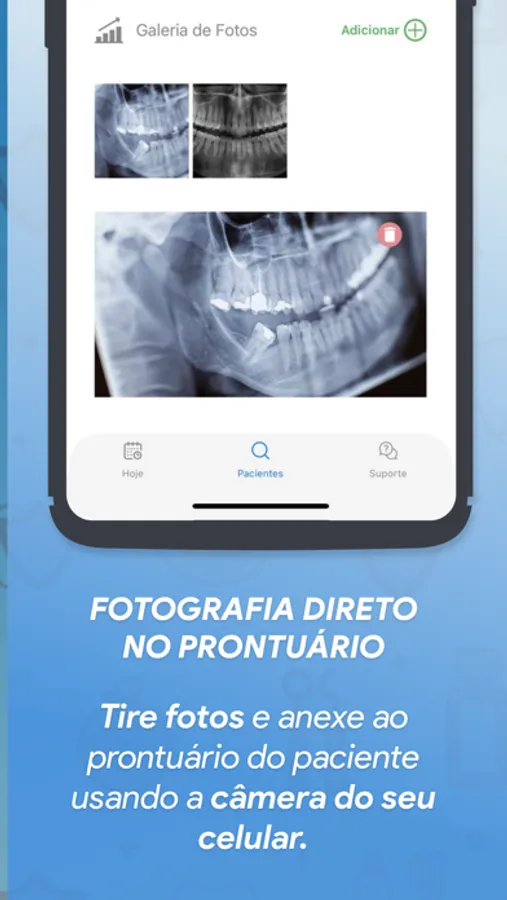 Precisa anexar uma foto ao prontuário? Use a câmera do seu celular e envia a foto diretamente pelo App. Super simples e rápido!