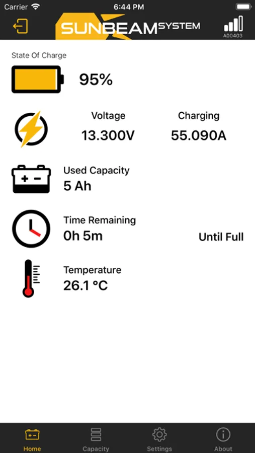 Main Screen is configurable and will show The state of Charge, Voltage, Charge and Discharge current, The used capacity in Ah, Projected time until full and empty, finally also the temperature inside the battery.
