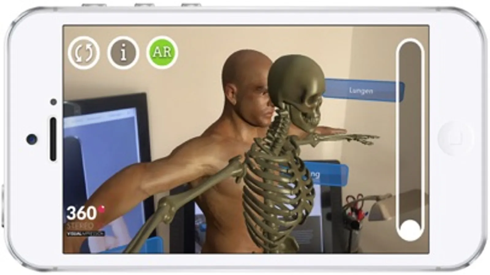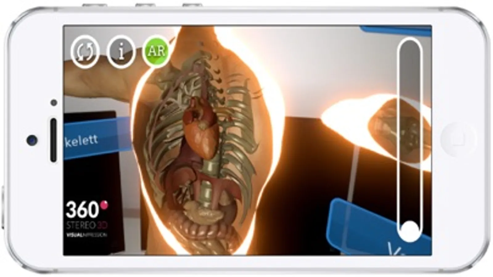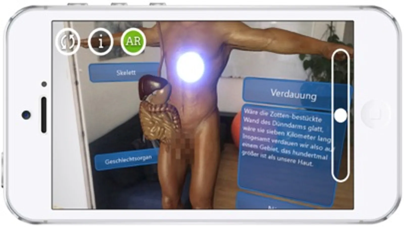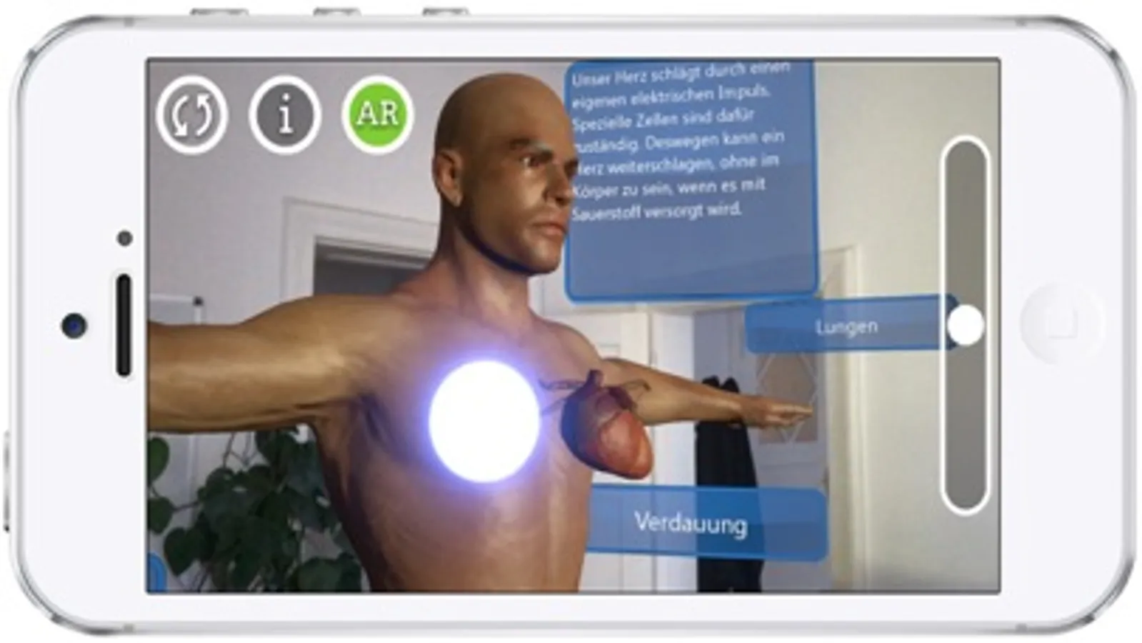 ARBody ist eine Augmented Reality App, die es möglich macht auf die gerade betrachtete reale Umgebung Textinformationen in ein anatomisches 3D Modell des menschlichen Körpers zu überblenden. Mit Deiner Smartphone Kamera siehst Du die reale Umgebung und gleichzeitig in Echtzeit (live) das 3D Modell. In unserer App kannst Du durch berühren der Texte, in der Nähe der Person, die unterschiedlichen Organe und Bestandteile des Körpers kennenlernen und verstehen. Indem Du Dich auf den Körper zu bewegst, blendet sich die Haut aus und Du kannst das menschliche Innenleben auf eine ganz neue Art und Weise erforschen. Nach dem Touch auf einen Textblock z.B. "Herz" verschwinden alle Körperteile bei Annäherung, bis auf das Herz. Nun kannst Du in Ruhe das jeweilige Organ betrachten und genau erkennen wo es sich im Körper befindet. Zusätzlich erhältst Du interessante Informationen zu jedem Organ. Du kannst den Körper auch auf einen Schreibtisch stellen und die Größe mit dem seitlich liegenden Slider verändern.