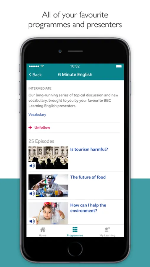 So, whether you want to study grammar, improve your pronunciation, develop your English through topical new stories or learn the latest phrases to use in your everyday conversations, our app has the series for you.