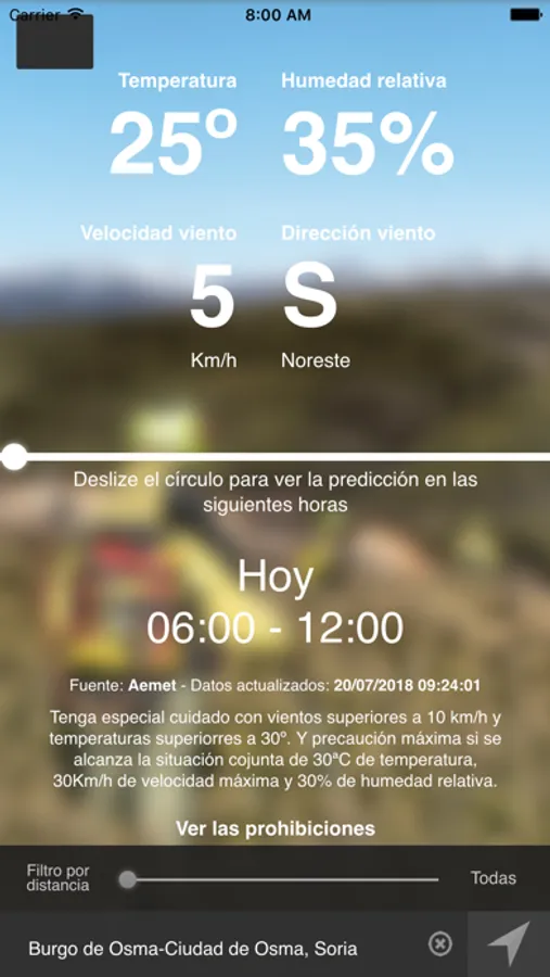 Esta aplicación te permite conocer las alertas meteorológicas y la época de peligro de incendios forestales en la que nos encontramos, y las limitaciones extraordinarias asociadas a las mismas para evitar el inicio del fuego: quemas de restos, uso de maquinaria, barbacoas y otros.