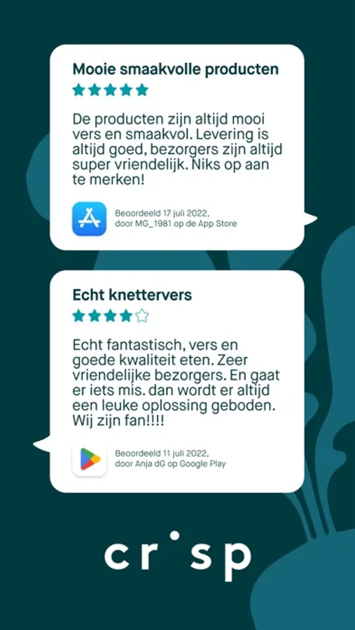 Zo haal je met Crisp dus heel gemakkelijk producten in huis vol smaak, volop in het seizoen en zonder onnodige toevoegingen. En wat je vóór 22.00 bestelt, brengen we de volgende dag al naar je toe in heel Nederland en Vlaanderen.