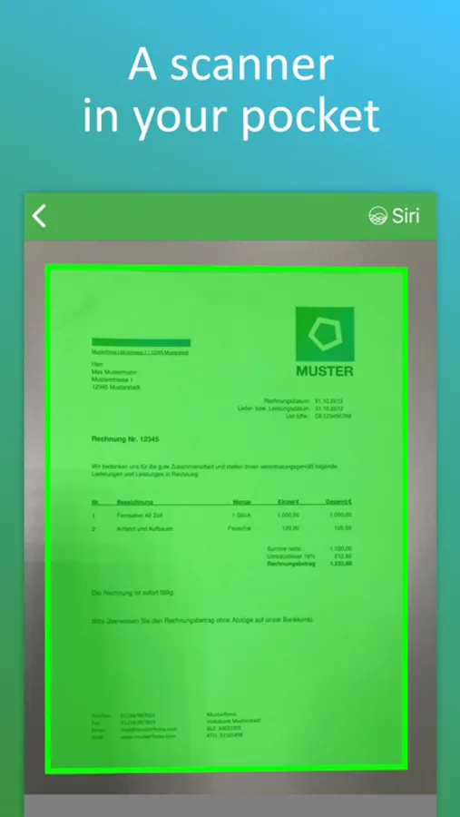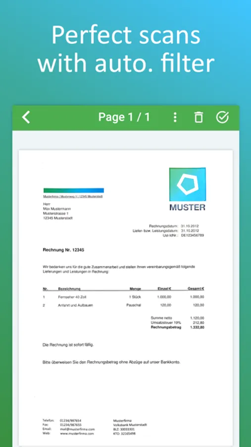 With intelligent document recognition and automatic shutter in the perfect moment, perspective correction, document edge detection, blur-reduction and color correction, you achieve a perfect scan with the PDF scanner app. Create a PDF scan or photo scan, use batch scanning for multiple pages and convert to PDF.