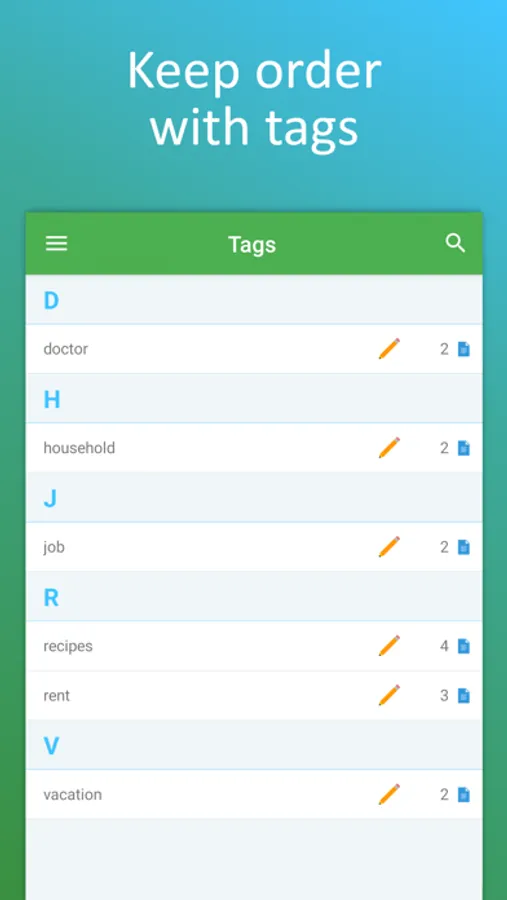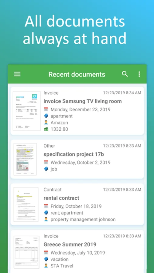 Create your own cookbook with document types + tags and browse with flexibility combining your criteria with the PDF scanner app and intuitive document manager.