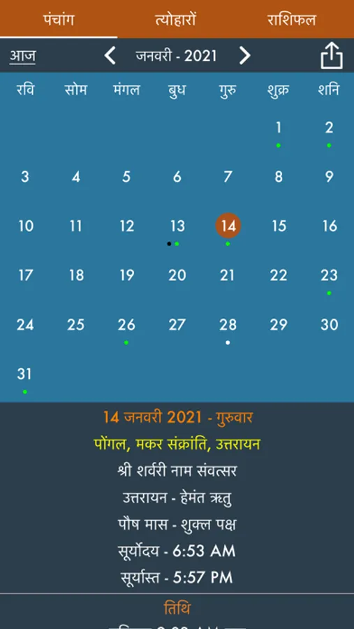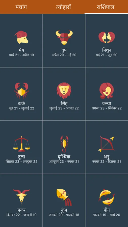 3) Swipe between Panchang, Festivals and Rashifal tabs to view detailed panchang results for the selected date on the calendar or festivals list for the selected month or the list of zodiac sun signs.