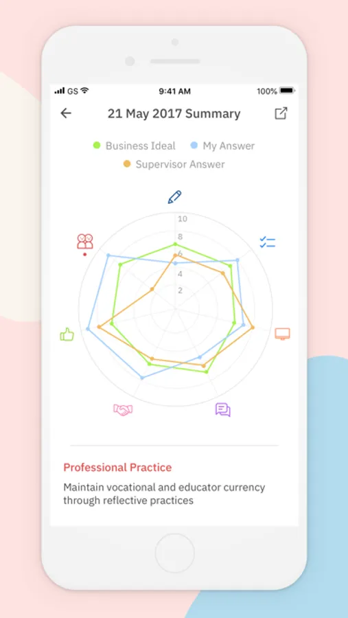 Educators use the profiling tool to map current experience and methods against the business ideals for each capability. Supervisors contribute to the educator’s self-assessment to provide a completed profile.