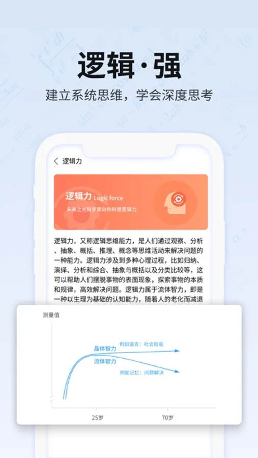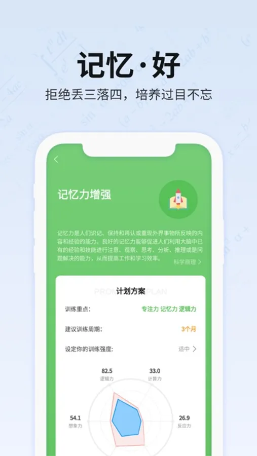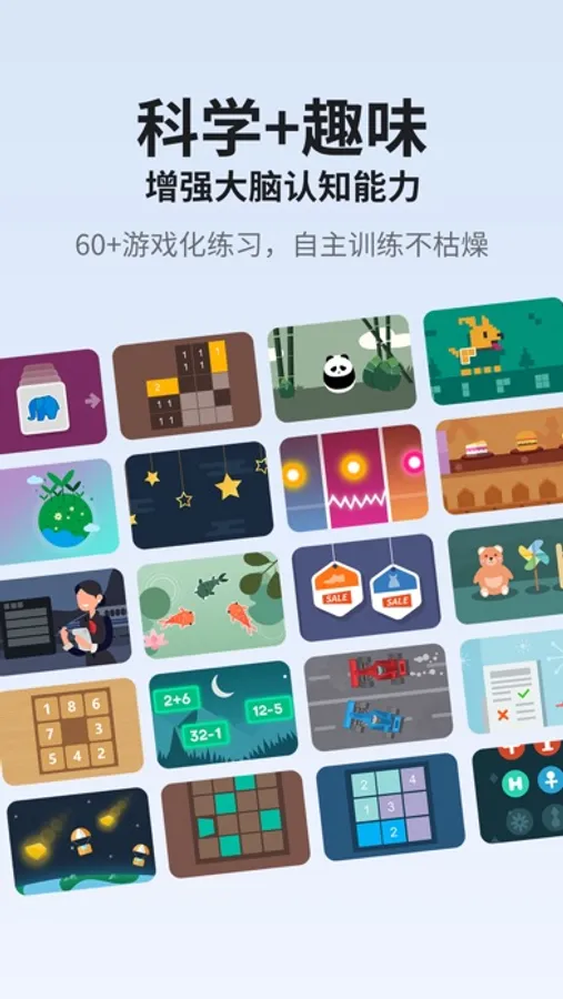 【未来之光】是一款主打趣味脑力训练的应用。APP内含60+款脑力游戏且持续更新,旨在为大家提供兼具科学性与趣味性的训练内容,助你训练记忆力、想象力、逻辑力、专注力、反应力、计算力等多项基础学习能力,在快乐中成长!