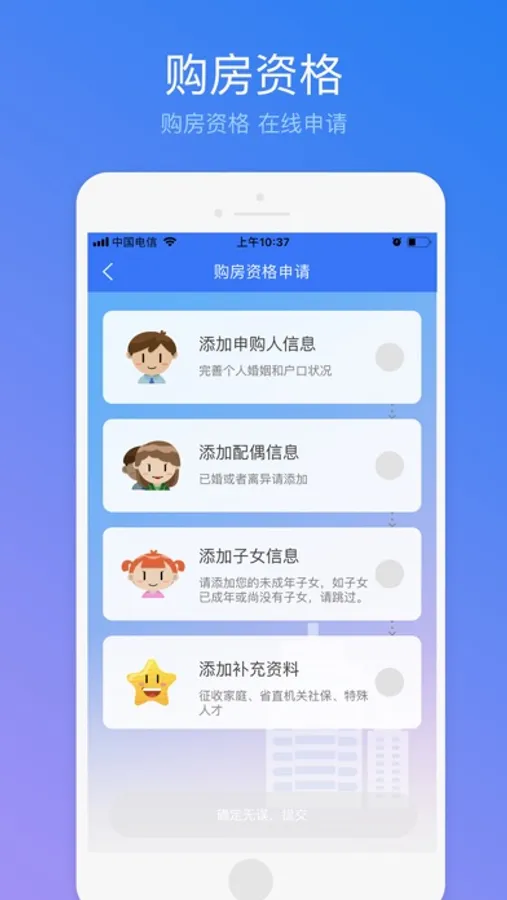 为有购房需求的市民提供在线的购房资格资料提交与审核,市民可在个人实名信息和购房资料审核通过后,在开盘的楼盘中通过应用中的扫一扫即可或得认购资格,减少以往人工排队,提交资料的麻烦