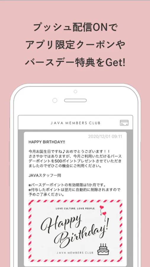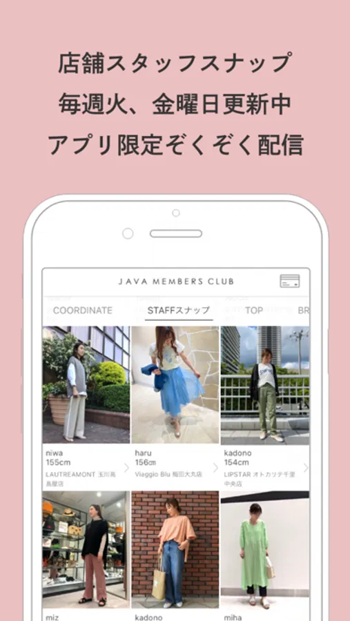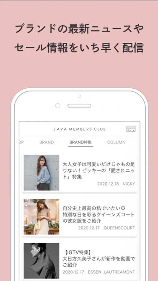 JAVA MEMBERS CLUB(ジャヴァメンバーズクラブ)公式アプリは、JAVAグループ直営のレディースファッションブランドの新作アイテムや店舗スタッフのコーディネート、最新ブランドニュースがチェックできたり、アプリから直接公式通販サイトJ Lounge(ジェイラウンジ)でのお買い物がお楽しみいただける他、アプリ限定のおトクなセール情報や限定クーポンが届いたり、JAVAブランドの魅力がギュッとつまった無料公式アプリです。