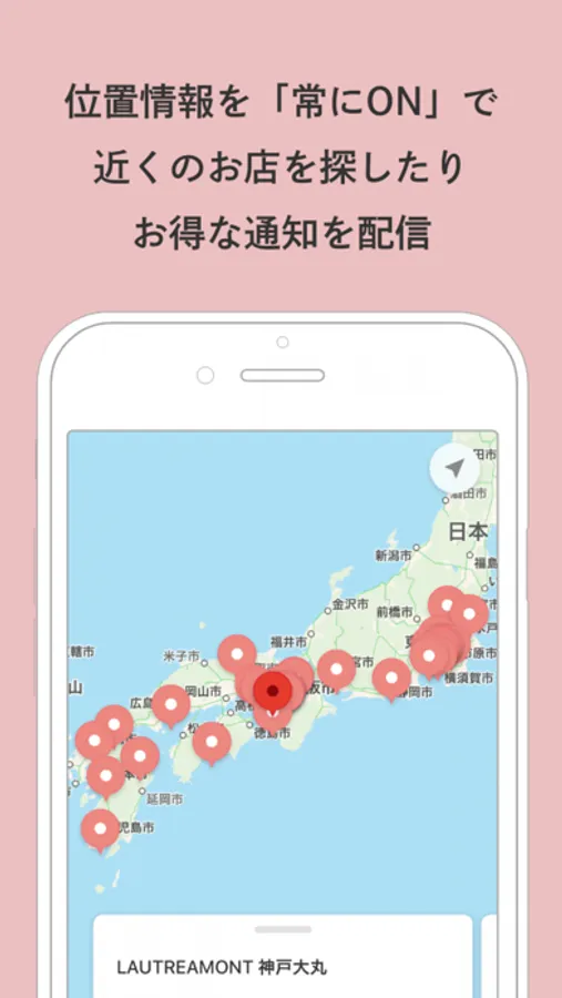 近くのショップを探す目的、その他の情報配信の目的で位置情報取得の許可をアプリからさせて頂く場合がございます。