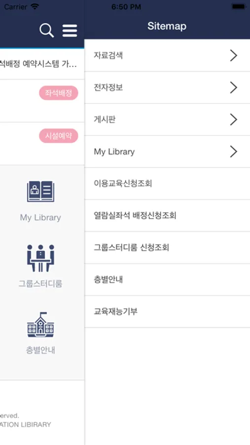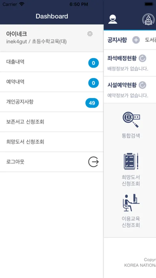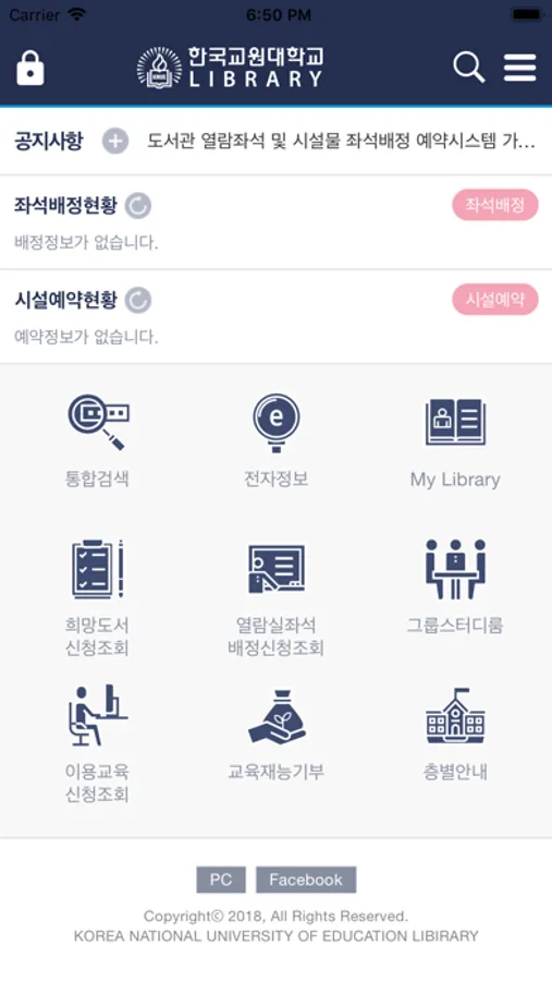 한국교원대학교 도서관 검색, 도서관이용안내, 공지사항 등 도서관 서비스를 제공하는 프로그램입니다.