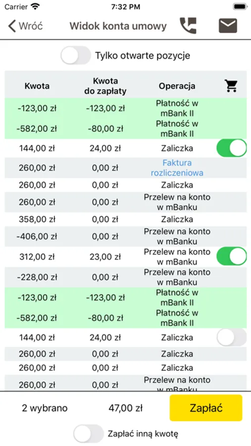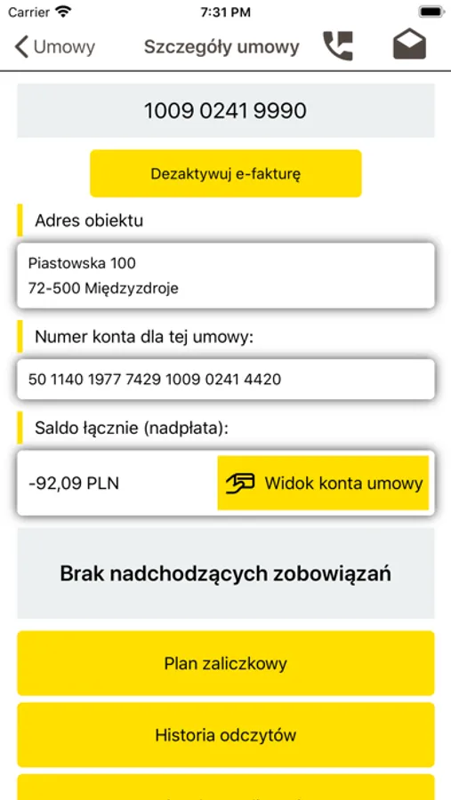 - podgląd informacji o rozliczeniach – saldo i zbliżające się płatności