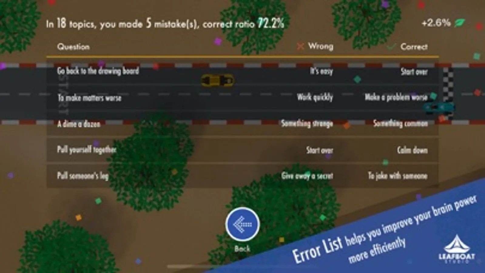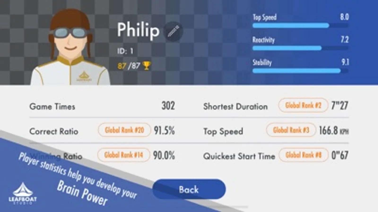 * Racer-style result summaries, and online rankings help you grow your "brain power" in an entertaining way