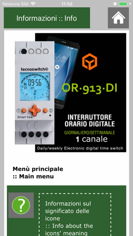 Questa App permette di programmare l'interruttore orario settimanale a 1 canale OR913DI della Tecno Switch Srl in modo semplice e intuitivo. Tutta la fase di inserimento e modifica degli orari per ogni giorno della settimana e per il festivo può essere svolta sul proprio smartphone stando comodamente seduti in poltrona. Le programmazioni possono essere salvate come files nel telefono e quindi trasferite successivamente sul dispositivo in pochi secondi tramite connessione WiFi. L'orologio OR913DI si comporta come un vero e proprio "Hot-Spot", quindi non è necessario che nel locale dove viene installato sia presente alcuna altra connessione WiFi o Internet. Il collegamento avviene direttamente tra lo smartphone e il dispositivo. L'orologio attiva la propria connessione WiFi con la pressione di un tastino o del joystick e la disattiva automaticamente dopo 5 minuti di inattività, in modo da garantire una maggior sicurezza informatica e da non emettere segnali a radiofrequenza quando non necessario. L'Applicazione è gratuita. Il manuale d'utilizzo completo può essere scaricato dal sito dell'Azienda.
