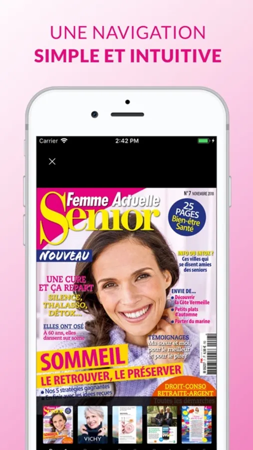 “Grâce à FEMME ACTUELLE SENIOR, chaque mois, explorez le monde, simplifiez-vous la vie avec le guide du quotidien, profitez de petits plaisirs et grands bonheurs et trouvez une mine d'informations santé, nutrition et bien-être pour garder la forme.”