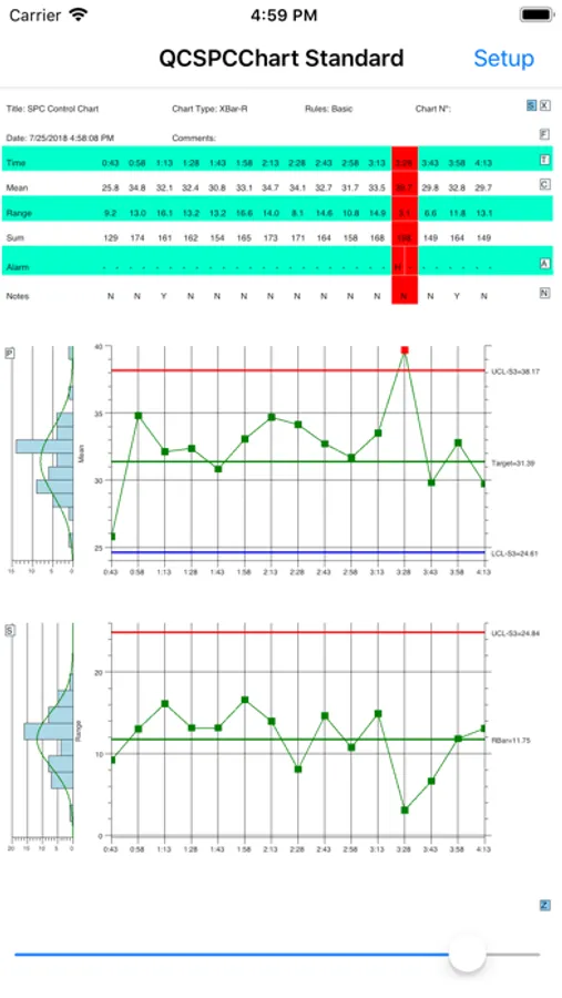 The SPC charts are displayed as one or two synchronized charts, under the control of a scroll bar. The scroll bar can be replaced by an integrated zoom control which allows for the display of charts with a custom time frame. Auto-scaling of the charts y-axes keeps everything in view. An integrated table appears above the chart, that displays information about the process under view, and each sample interval plotted in the chart. The table displays time, individual sample values, sample statistics, process indices, alarm status, and any notes entered for that sample interval.