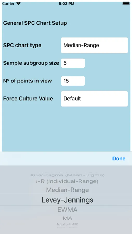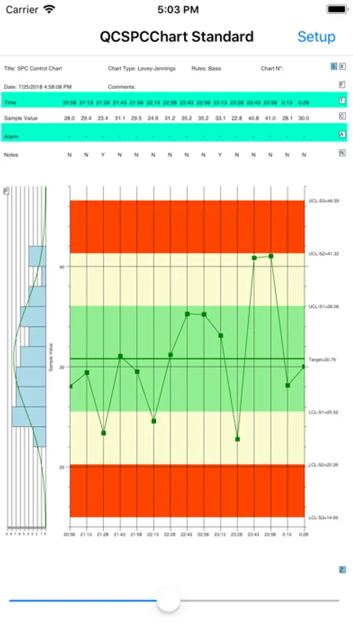 The user can customize the SPC chart and control limits using built-in setup forms. Both auto-calculated and manually set control limits are supported. The user can manually input and edit sample data from within the program. The user can also import sample data from a CSV (comma separated value) file. The entire chart setup, and data, can be saved on the host device so that they are easily accessible the next time you use the app. You can even set the current setup to be auto-loaded the next time the app starts.