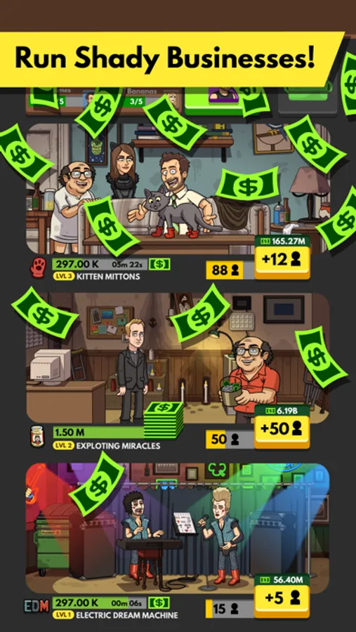 Transform all of The Gang’s crazy businesses into idle money-making machines! Idle clicker games are known for their relaxed play style. Automate businesses so that Mac, Dennis, Dee, Charlie and Frank can keep collecting cash even when you aren't playing. Upgrade characters and businesses by collecting cards that help you to increase the money-making capabilities of each idle business. With your help, The Gang will become true idle tycoons!