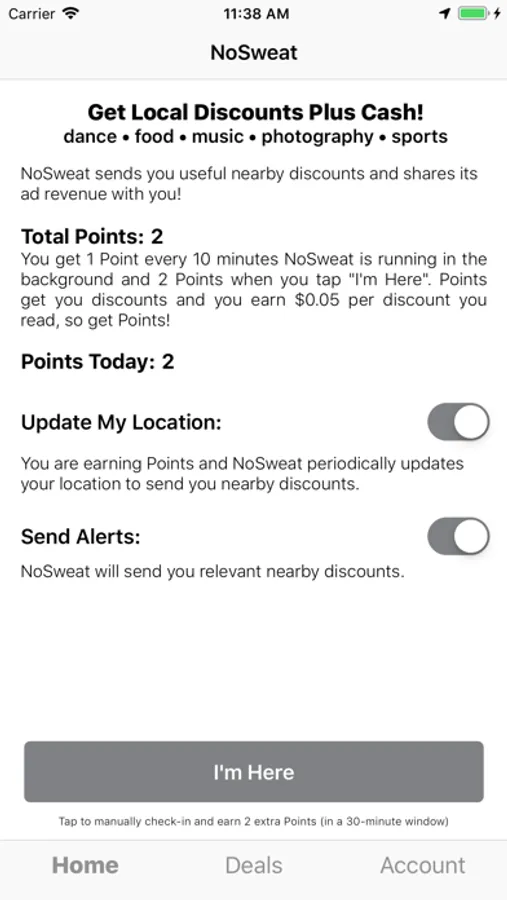 You get 1 NoSweat Point for every 10 minutes NoSweat is running in the background and 2 Points when you tap "I'm Here" (once in 30 minutes).