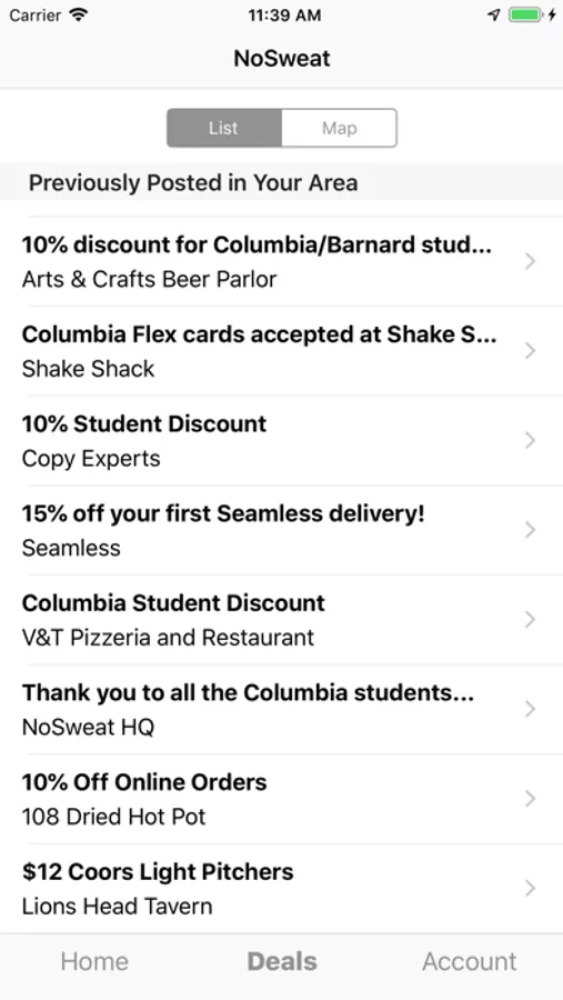 First, there's no registration or login to use NoSweat. You just allow it to access your location and you'll get, from time to time, nearby discount coupons and also $0.05 for each discount you view!