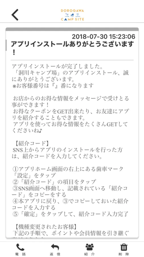 洞川キャンプ場のアプリをSNSを通じてお友達に紹介する事ができます。