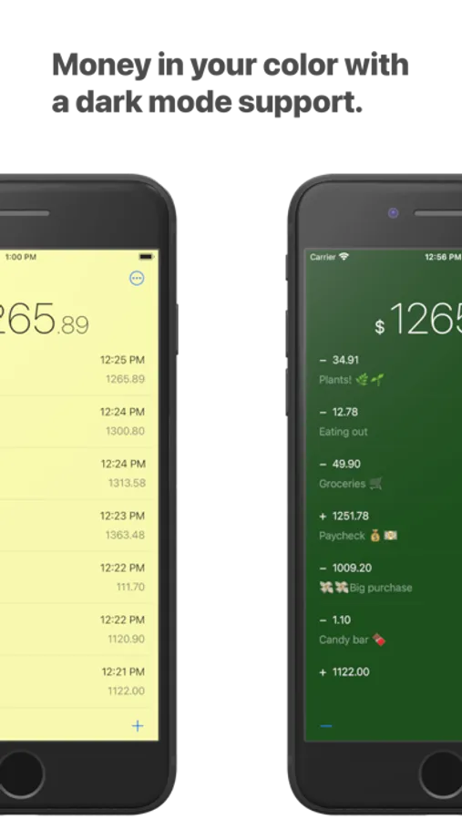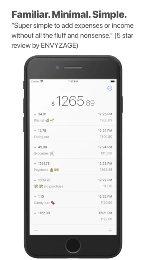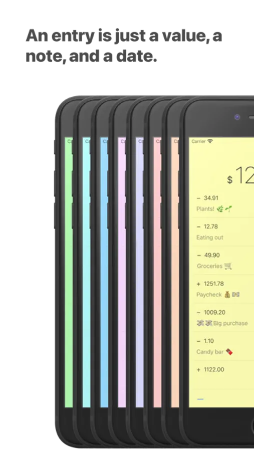 An entry is just a value, note, and a date. To create an entry, you just tap the minus or plus buttons. The minus button creates an entry which subtracts from the total. The plus button creates an entry which adds to the total.