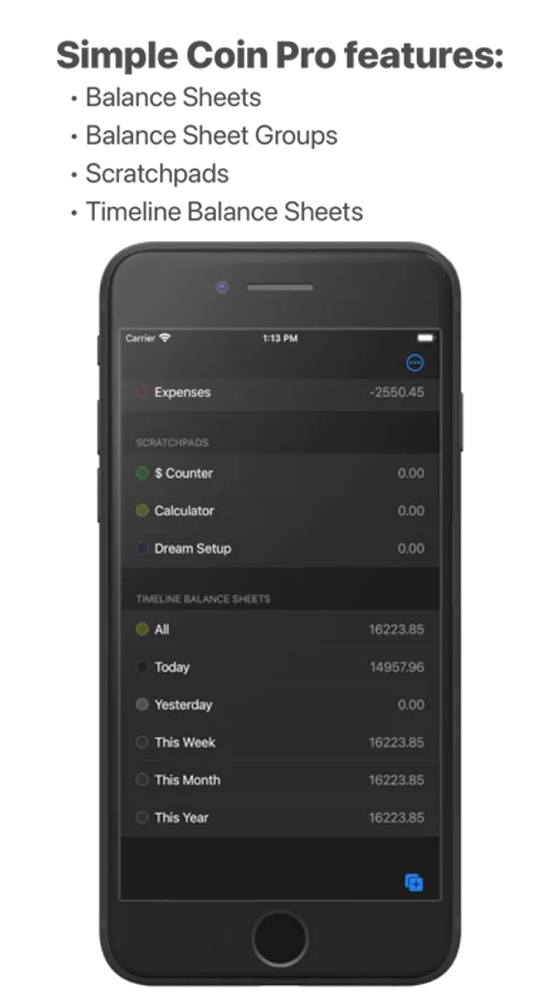 The pro version of Simple Coin steps up organization, giving you access to multiple separate balances (called balance sheets). On top of that, you'll get balance sheet groups, and timeline balance sheets like yesterday and this week.