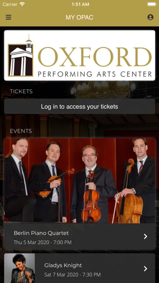 The free My OPAC app is the easiest way to purchase and use tickets for all performances at the Oxford Performing Arts Center. With the app, there is no need to print your tickets at home or wait in the will call line - just show your phone at the door!